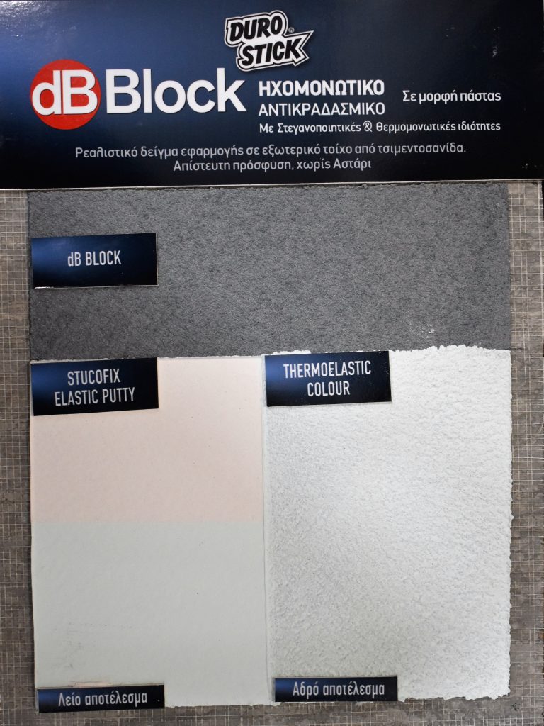 Η εσωτερική θερμομόνωση και ηχοπροστασία που επιτυγχάνεται με την εφαρμογή του dB BLOCK της DUROSTICK είναι η πλέον ενδεδειγμένη λύση για παλαιές, αλλά και νέες κατοικίες όπου εύκολα, γρήγορα και οικονομικά μπορούν να αναβαθμίσουν την θερμομονωτική και ηχομονωτική αξία τους. Λόγω του μικρού πάχους εφαρμογής του (3mm) είναι ιδανικό για εσωτερικούς τοίχους (υγρούς, κρύους), ταβάνια, σοφίτες, ντουλάπες εσωτερικά, χωρίς την παραμικρή ‘αναστάτωση’ του χώρου ούτε και έξοδα για αποξήλωση ( π.χ. σοβατεπί) ή μεταφορά τους (πρίζες). Σε κάθε κτίριο που δεν μπορεί να θερμομονωθεί εξωτερικά, όπως για παράδειγμα διατηρητέα νεοκλασικά, ή πολυκατοικίες με ιδιοκτήτες που δεν συμφωνούν σε εξωτερικές παρεμβάσεις, το dB BLOCK αποτελεί μοναδική λύση. Ηχομονώνει και θερμομονώνει εσωτερικά τους χώρους των κατοικιών, με ένα ελαστικό ηχομονωτικό και ενεργειακό μανδύα προστασίας, ικανό να ‘διακόψει’ τη ροή των αερόφερτων εξωτερικών και εσωτερικών, ενοχλητικών θορύβων. Ενεργειακά, θα μειώσει τη διαφορά θερμοκρασίας μεταξύ εσωτερικού και εξωτερικού περιβάλλοντος, περιορίζοντας δραστικά τη συμπύκνωση των υδρατμών που σαν συνέπεια έχουν την ανάπτυξη μυκήτων και τη δημιουργία μούχλας. Το φυσικό αποτέλεσμα της εφαρμογής του dB BLOCK, είναι η επίτευξη και της εξοικονόμησης ενέργειας έως και 30%.